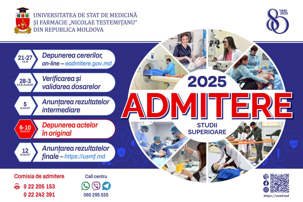 Universitatea de Stat de Medicină și Farmacie „Nicolae Testemițanu” din Republica Moldova anunță cea de-a 4-a etapă a concursului de admitere – depunerea actelor în original, în perioada 6-10 august 2025.