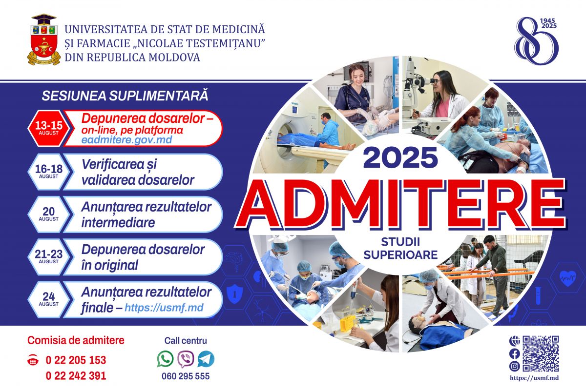 Universitatea de Stat de Medicină și Farmacie „Nicolae Testemițanu” din Republica Moldova anunță organizarea sesiunii suplimentare de admitere pentru locurile rămase neacoperite atât pentru studii superioare de licență și integrate, cât și pentru studii superioare de master, la următoarele programe de studii:
